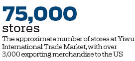 Exports to the US account for 40 million to 50 million yuan of its output. Their outlet in Yiwu market sees less than 5 percent of its exports go to the US, but their sales through Amazon are mostly US-bound.
