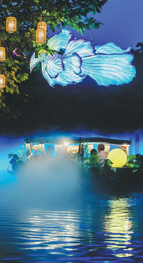 As night falls, an outdoor movie is playing in a public area in front of the Fisher Coffee shop on Shiquan Street in Suzhou, Jiangsu province, captivating residents. Nearby, lights flicker on the river as tourists on boats lift their phones to capture the enchanting scene.