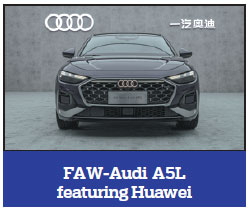 FAW-Audi displayed the allnew A5L at the Auto Shanghai, the first luxury fuel-powered sedan in China to adopt Huawei's intelligent driving system. Built on the Premium Platform Combustion and equipped with Audi's End-to-End Electronic Architecture 1.2, which is shared with the Premium Platform Electric, this architecture integrates five high-performance computing units that manage driving dynamics, driving assistance, infotainment, comfort systems, and connectivity, enabling seamless software upgrades and personalized digital services. The A5L utilizes lidar, radar, cameras, and ultrasonic sensors to enable advanced driver assistance across urban and highway scenarios. The A5L is powered by the latest EA888 Evo5 engine with Variable Turbine Geometry turbo-charging, delivering 200 kilowatts of peak output. It also features a 48-volt Mild-Hybrid Electric Vehicle Plus system, supporting enhanced efficiency and partial electric driving capabilities.