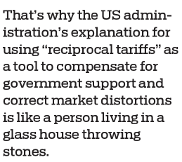 That's why the US administration's explanation for using "reciprocal tariffs" as a tool to compensate for government support and correct market distortions is like a person living in a glass house throwing stones.