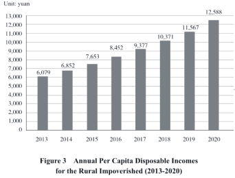 The incomes of the impoverished are increasing (Figure 3). The per capita disposable income of the rural poor increased from RMB6,079 in 2013 to RMB12,588 in 2020, up by 11.6% per annum on average. The growth rate was 2.3 percentage points higher than the national rural average. Their salary income and operative income kept increasing over the years in proportion to their transfer income, showing a stronger ability to shake off poverty through their own efforts.