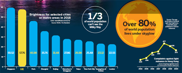 Hong Kong leads global cities with severe light pollution. A 2018 survey showed that in 10 selected big cities and areas of high light intensity around the world, Hong Kong's downtown illumination ranked second after Singapore's. The city's brightness exceeded Paris', Shanghai's and Beijing's, and is over twice that of New York or London. The city registers about 300 resident complaints of "violent" outdoor lighting annually.