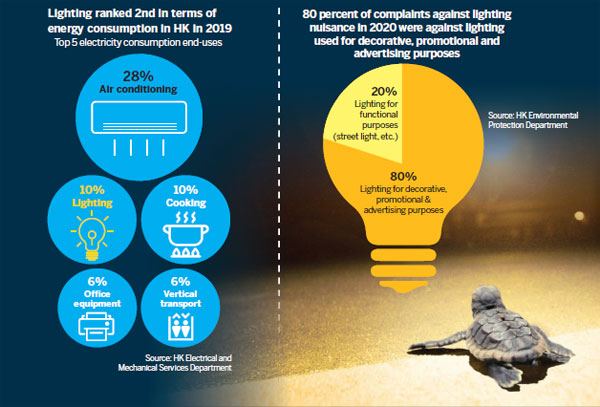 The Environment Bureau launched the Charter on External Lighting in 2016 as the most promising voluntary agreement in recent years, encouraging downtown business owners to switch off unnecessary lighting at night. It was signed by 5000 business owners.