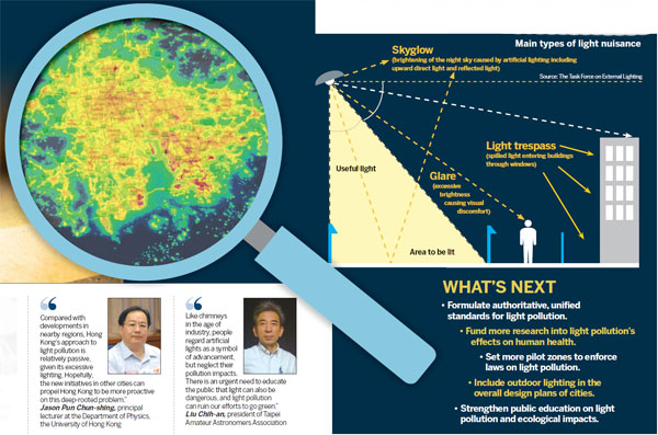 Liu urges raising public awareness on the issue to be prioritized. Light pollution, compared with air or water pollution, is a relatively new alarm which the public is not yet sensitized to. "If the faucet is not turned off, we know that we are wasting water. If the light is unnecessarily scattered to the sky or elsewhere, few people realize that is also a kind of waste."