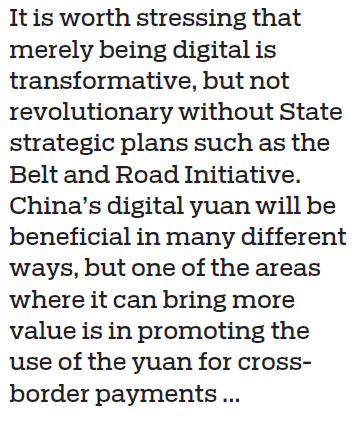 It is worth stressing that merely being digital is transformative, but not revolutionary without State strategic plans such as the Belt and Road Initiative (BRI). China's digital yuan will be beneficial in many different ways, but one of the areas where it can bring more value is in promoting the use of the yuan for cross-border payments, thereby converting some of the US dollar-denominated international trade transactions into renminbi-denominated ones, and challenging the dominance of the US dollar in international trade and finance.