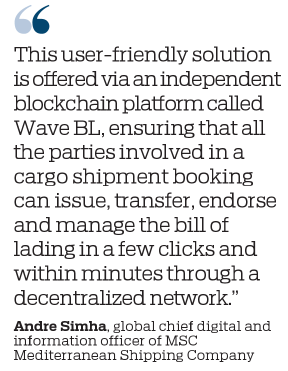"At MSC, we strongly believe that digitalization is the way forward, enabling not only greater operational efficiencies, reliability, transparency, speed, security and sustainability, but also greater collaboration and customer experience," said Andre Simha, global chief digital and information officer of MSC Mediterranean Shipping Company.