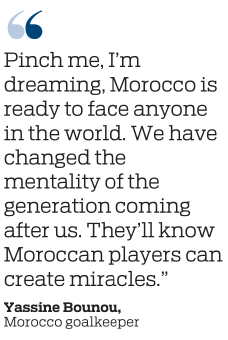 "Pinch me, I'm dreaming," Morocco goalkeeper Yassine Bounou said. "Morocco is ready to face anyone in the world. We have changed the mentality of the generation coming after us. They'll know Moroccan players can create miracles."