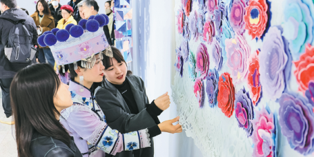 At the exhibition, the "Enjoying Nature" series of Bai ethnic tie-dyeing works co-created by Li Wei, professor of the academy, and Duan Yuan, an intangible cultural heritage inheritor of the Bai ethnic tie-dyeing project, has won significant interest from visitors.