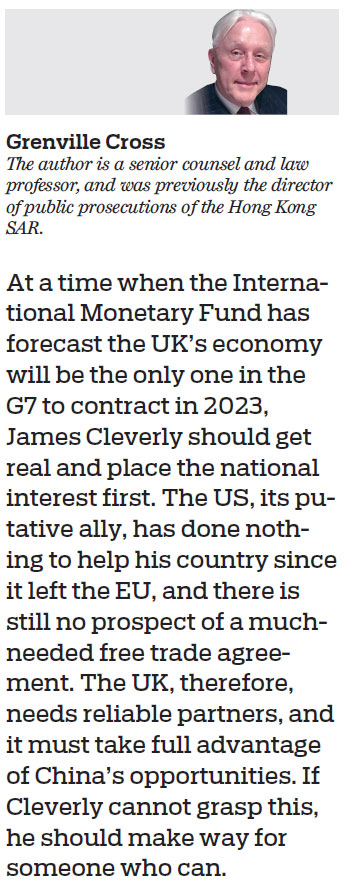 At a time when the International Monetary Fund has forecast the UK's economy will be the only one in the G7 to contract in 2023, Cleverly should get real and place the national interest first. The US, its putative ally, has done nothing to help his country since it left the EU, and there is still no prospect of a much-needed free trade agreement. The UK, therefore, needs reliable partners, and it must take full advantage of China's opportunities. If Cleverly cannot grasp this, he should make way for someone who can.