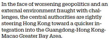 In the face of worsening geopolitics and an external environment fraught with challenges, the central authorities are rightly steering Hong Kong toward a quicker integration into the Greater Bay Area.