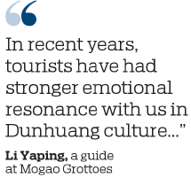 "Many visitors have questions before touring this art palace, and they will share new discoveries with us during their visit," said Li Yaping, a guide at Mogao Grottoes. "In recent years, tourists have had stronger emotional resonance with us in Dunhuang culture, and many are moved to tears by the beauty of the 1,000-year-old wall paintings."