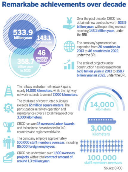 CRCC has scaled up its international businesses to 140 countries and regions with 85,000 foreign employees and signed contracts worth 533.9 billion yuan ($73.34 billion) in countries and regions involved in the initiative.