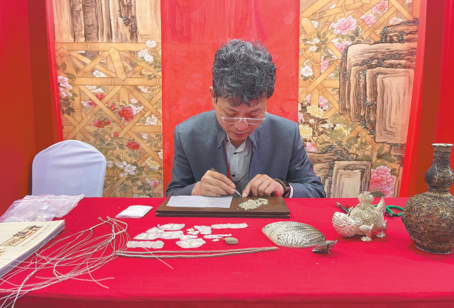 The silver handbag covers, vases and mythical animals on his stand were notable for their intricate, stunning patterns. Everything was done by hand, including pulling the silver thread, which can be as thin as a hair. For a long time, people were unfamiliar with the art, because it used to be exclusively used by the royal families and symbolized wealth, Yuan adds.