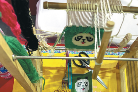 On the wooden loom at her stand, Guo gave the audience a measure of the intricacy of the work, as her fingers flew across densely and vertically arranged polychromatic yarns, tying special knots.