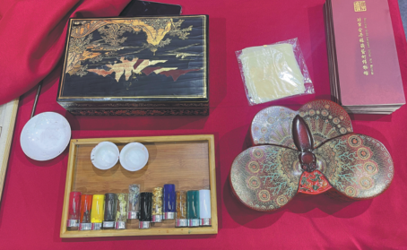 A dozen meters away, jewelry and lunchboxes decorated with patterns of landscapes, birds and butterflies glittered on the gold lacquer inlay stand.