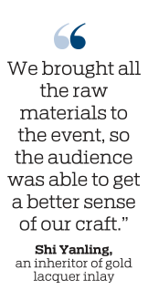 She was one of 1,000 delegates from all over the world who brought 500 intangible cultural heritage projects and 3,000 exhibits and artworks to the four-day cultural event, which consisted of sections that displayed China's efforts in protecting and supporting intangible cultural heritage, distinctive domestic handicrafts, international cultural forms and creative cultural products.