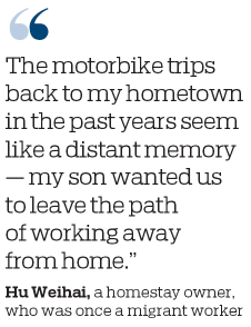 Hu's decision to enter the hospitality business at his hometown put an end not only to his 20-year career in the furniture business, but also to the 650-kilometer journey he made home on his motorbike every Spring Festival.
