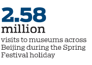 Statistics from the Beijing Cultural Heritage Bureau show that museums across the city received 2.58 million visits during the eight-day holiday that concluded on Feb 17.