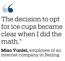 "The decision to opt for ice cups became clear when I did the math," said Miao Yunlei, a 29-year-old who works for an internet company in Beijing.