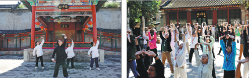 An exercise known as baduanjin, a form of Taoist qigong that combines a set of eight traditional Chinese fitness movements with meditation and breathing, has been taught on weekends by priests for many years, attracting enthusiastic trainees.