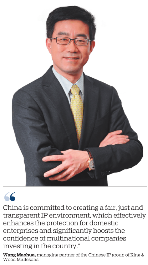 "China is committed to creating a fair, just and transparent IP environment, which effectively enhances the protection for domestic enterprises and significantly boosts the confidence of multinational companies investing in the country," said Wang Maohua, a veteran IP lawyer and managing partner of the Chinese IP group of King & Wood Mallesons.