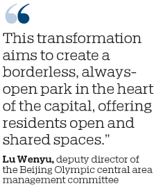 The removal of six security checkpoints and over 10,000 meters of fencing are key steps in the overhaul, Lu Wenyu, deputy director of the Beijing Olympic central area management committee, said in a recent statement.