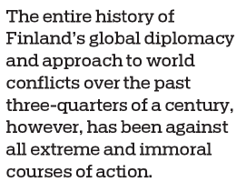 The entire history of Finland's global diplomacy and approach to world conflicts over the past three-quarters of a century, however, has been against all extreme and immoral courses of action. Stubb's visit to China, by contrast, should be welcomed as a sensible and constructive effort to build and preserve bridges of communication, cooperation and peace even in the most fraught and dangerous of times.
