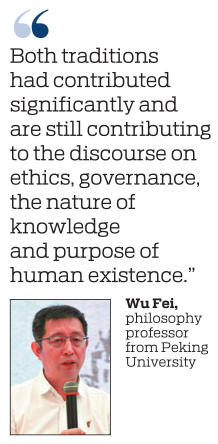 "Both traditions had contributed significantly and are still contributing to the discourse on ethics, governance, the nature of knowledge and purpose of human existence," says Wu Fei, philosophy professor at the prestigious Peking University."For that reason, those who study one of them today, me included, are obliged to learn about the other, although the two traditions had evolved separately."