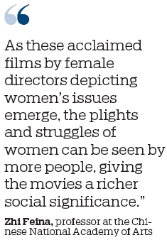 "As these acclaimed films by female directors depicting women's issues emerge, the plights and struggles of women can be seen by more people, giving the movies a richer social significance," said Zhi.