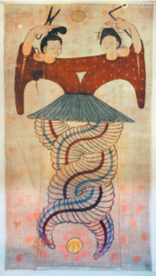 Patterns of Nyuwa, the mother goddess in Chinese mythology, and Fuxi, the legendary ancestor of the Chinese nation, embracing and looking at each other with their lower bodies twisting into snake tails, coiled in a spiral structure, have been discovered in many places of China since the Han Dynasty, often seen on stone components of tombs or silk paintings. The patterns were probably influenced by the Shang Dynasty images with human heads and snake bodies, he adds.