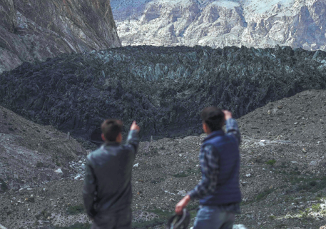 Men point at the black Shisper glacier in the Karakoram mountain range of Pakistan's Gilgit-Baltistan region in 2019.