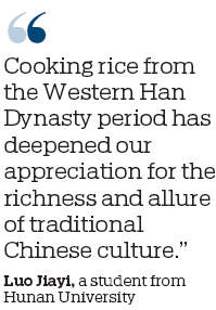 In their project, which combined historical research and culinary experimentation, the team from the Yuelu Academy of Hunan University in Hunan province cooked rice according to recipes recorded in a bamboo manuscript titled "Shi Fang", an ancient text dating back to the Western Han Dynasty (202 BC-AD 8).