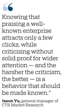 The role of platforms like Douyin in amplifying public disputes is also a factor that should be closely monitored, analysts said. "Knowing that praising a well-known enterprise attracts only a few clicks, while criticizing without solid proof for wider attention — and the harsher the criticism, the better — is a behavior that should be punished," said Jason Yu, general manager of CTR Market Research.