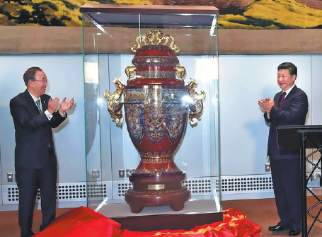 In the stately Conference Building at the United Nations Headquarters in New York City, a 65-inch-tall resplendent bronze vessel gleams under soft light, its cloisonne enamel blazing in vibrant Chinese red.