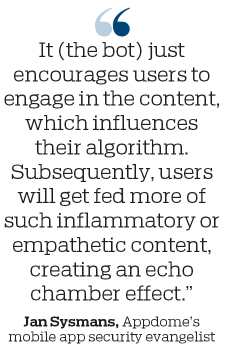 Such traffic typically comes in the form of social media post hijacking, where bots produce inflammatory or empathetic messages to rouse viewers to engage with the content, said Jan Sysmans, Appdome's mobile app security evangelist based in Singapore.