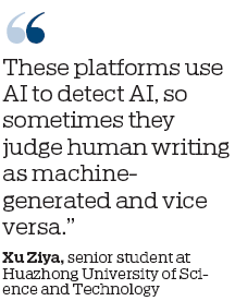 Xu Ziya, a senior at the Huazhong University of Science and Technology, told China Daily she has turned to social media tutorials on platforms such as Xiaohongshu to help reduce the AI rate in her journalism thesis. She used AI to summarize interviews she conducted, finding it more effective than doing it manually.