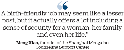 "We support each other a lot. A birth-friendly job may seem like a lesser post, but it actually offers a lot including a sense of security for a woman, her family and even her life," Meng said.