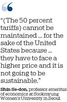 Shin Se-don, professor emeritus of economics at Sookmyung Women's University in Seoul, said the 50 percent tariffs will not last long because it will become a heavy burden for US manufacturers.