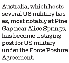 Australia, which hosts several US military bases, most notably at Pine Gap near Alice Springs, has become a staging post for US military under the Force Posture Agreement. As a result, much of northern Australia has been turned into US military post, and Canberra has signed the AUKUS agreement (a trilateral security partnership among Australia, the United Kingdom and the United States), which will see Australia spend some A$368 billion on a nuclear submarine program, aimed as part of an aggressive US strategy to block Chinese access to the wider world through the South China Sea.