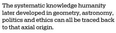 As a Chinese saying goes, "Had Heaven not sent forth Confucius, eternity would have been without a dawn." Globally, the Axial Age of rational reflection, marked by figures like Confucius and Aristotle, ushered in a new era of human civilization. The systematic knowledge humanity later developed in geometry, astronomy, politics and ethics can all be traced back to that axial origin.