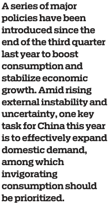 A series of major policies have been introduced since the end of the third quarter last year to boost consumption and stabilize economic growth. Amid rising external instability and uncertainty, one key task for China this year is to effectively expand domestic demand, among which invigorating consumption should be prioritized.