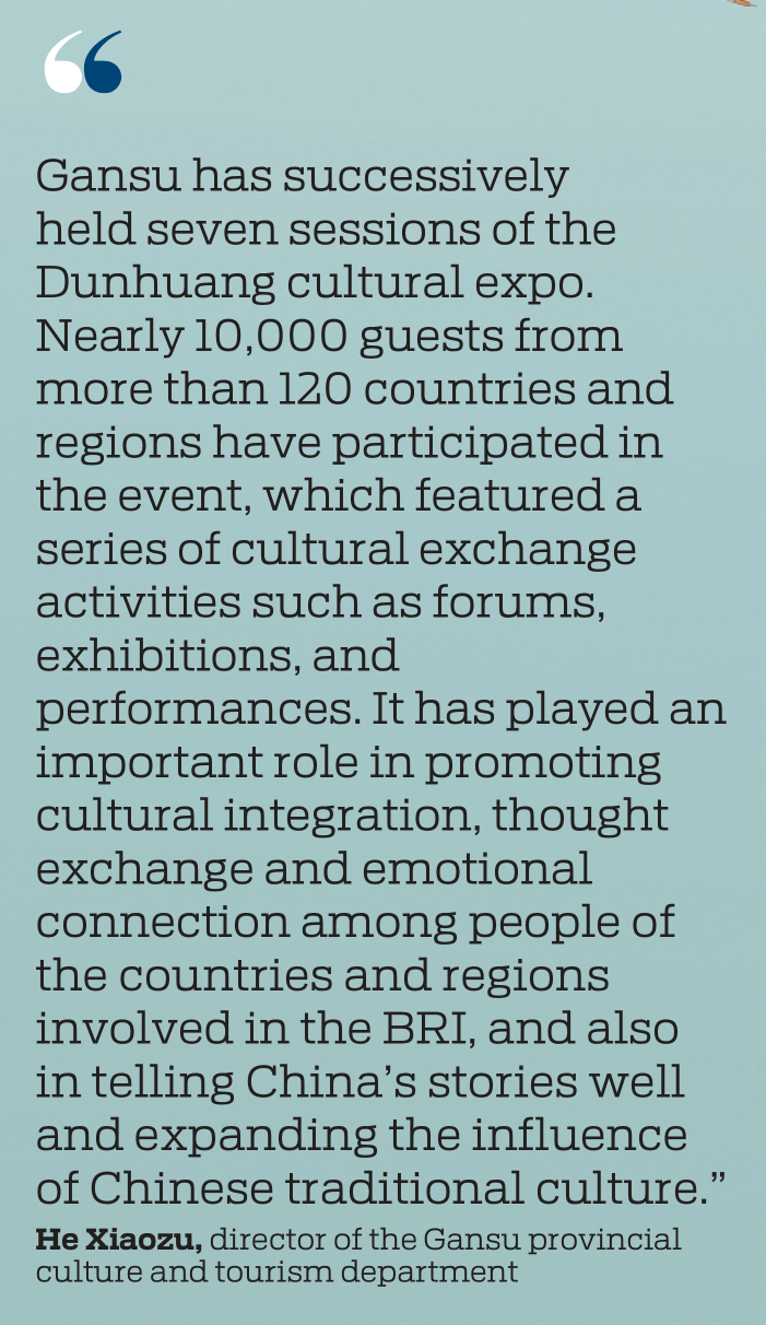 He Xiaozu, director of the Gansu provincial culture and tourism department, said: "Gansu has successively held seven sessions of the Dunhuang cultural expo. Nearly 10,000 guests from more than 120 countries and regions have participated in the event, which featured a series of cultural exchange activities such as forums, exhibitions, and performances. It has played an important role in promoting cultural integration, thought exchange and emotional connection among people of the countries and regions involved in the BRI, and also in telling China's stories well and expanding the influence of Chinese traditional culture."